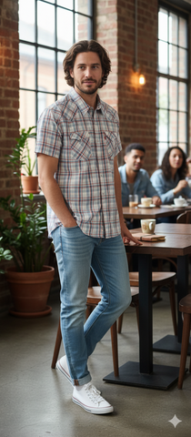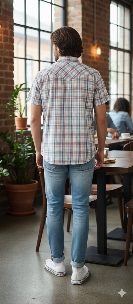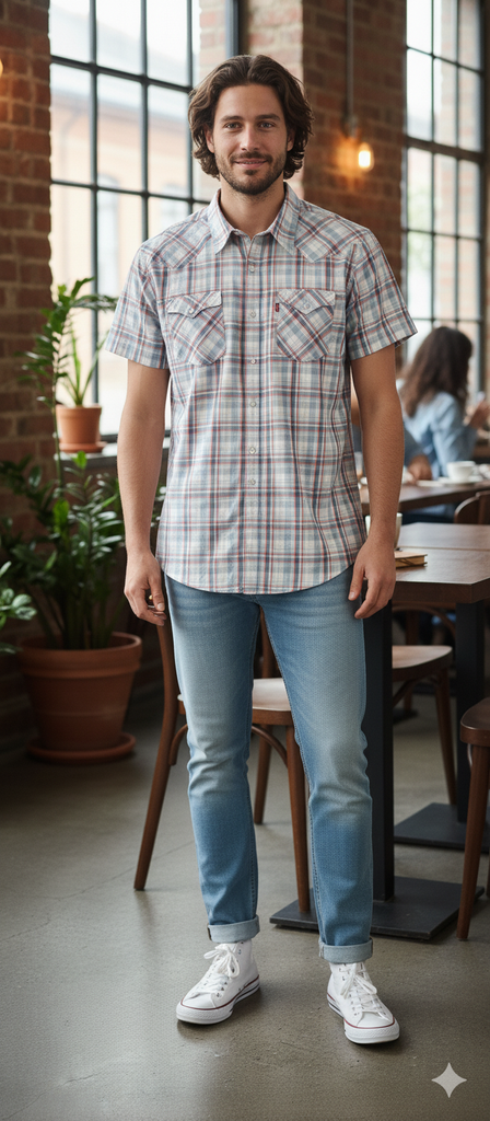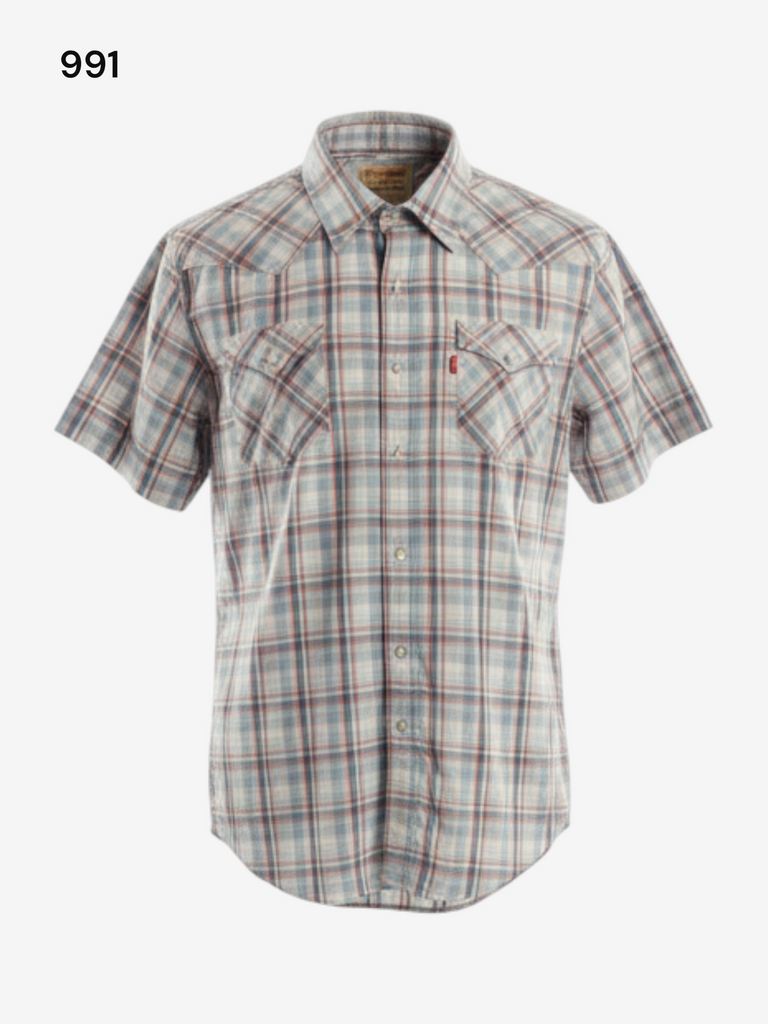 Levis Western Short Sleeve Shirt – perfect for summer. Classic Western fit with characteristic yokes and a plaid (grey-white-red) pattern. Comfortable snap-button closure and two chest pockets.