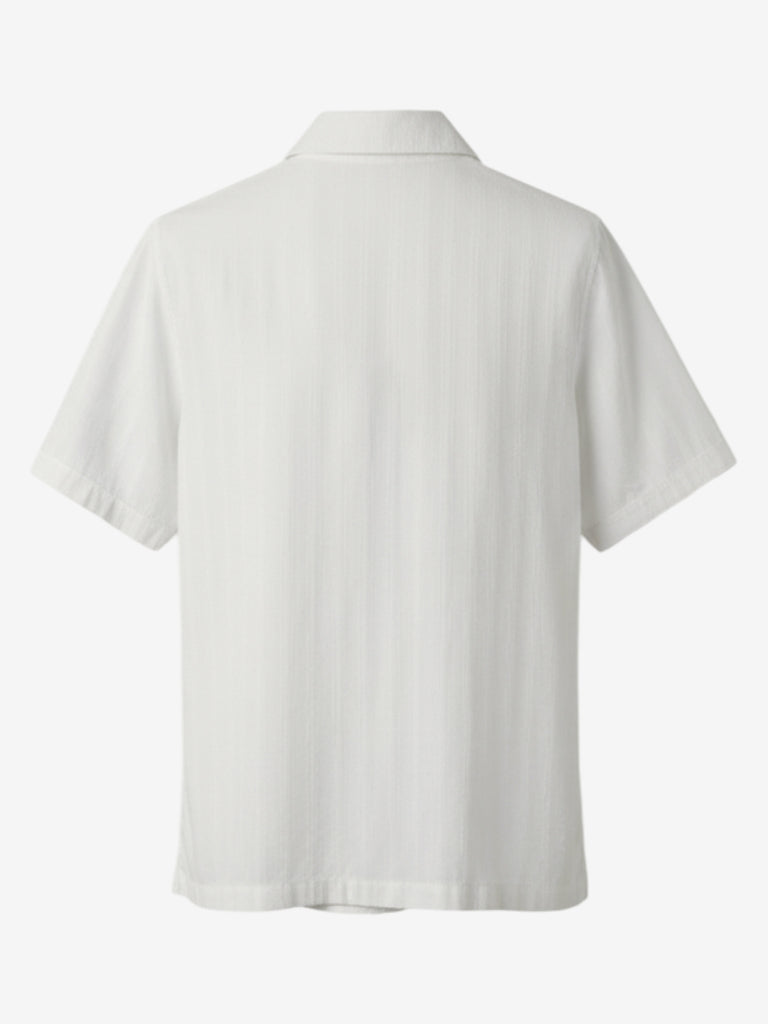 Description: Elegant and airy men's white short-sleeve shirt. Perfect for warm weather. The cut ensures freedom of movement and wearing comfort, and the subtle pattern near the placket adds a unique character. An essential item for a casual summer wardrobe.