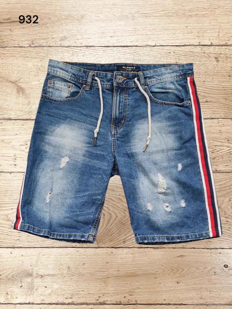 - Description: 5-Pocket Design. Fastened with a zip and button. The shorts have a drawstring and three colourful stripes sewn onto the sides.
