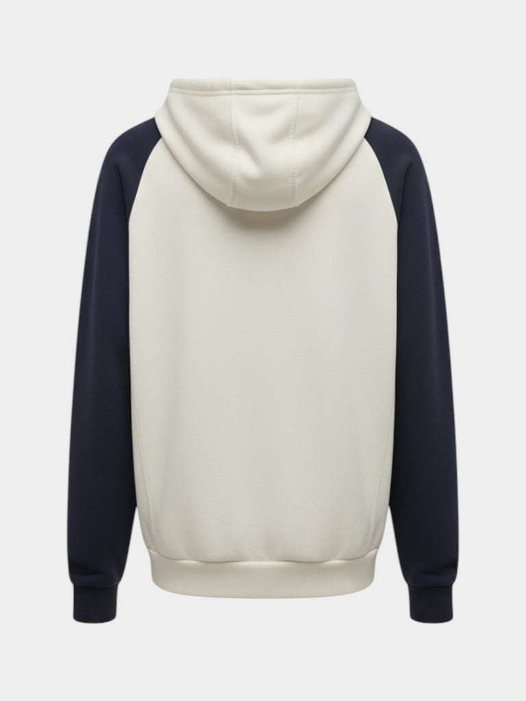 Description: The perfect blend of sporty comfort and classic style with the Adidas hooded sweatshirt. This versatile sweatshirt is a great choice for training, relaxing at home, or everyday wear. Made from a high-quality blend of 70% cotton and 30% polyester, this sweatshirt offers softness, breathability, and durability. It's comfortable against the skin and easy to care for. The classic design with a hood and kangaroo pocket guarantees freedom of movement and practicality. The white body contrasts with navy raglan sleeves, giving it a modern and dynamic look. The large Adidas logo on the front highlights the brand's sporty character. Ribbed cuffs and hem ensure a comfortable fit, while the drawstring-adjustable hood protects against the cold. Perfect for wearing with jeans, joggers, or shorts, it's perfect as a layering piece on cooler days or as a standalone piece.