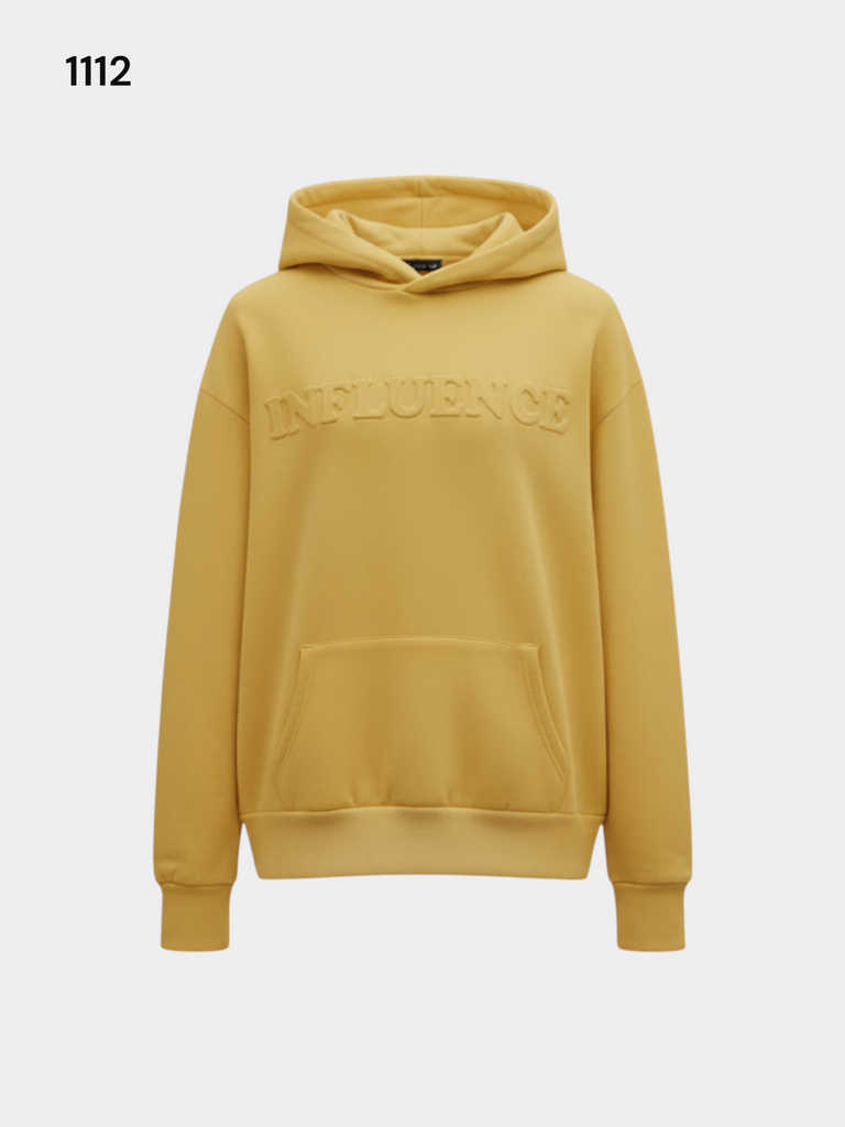 The sweatshirt features a classic hooded cut and a practical kangaroo pocket on the front. The unique, raised "INFLUENCE" lettering on the chest adds character and a modern look. Perfect for both sporty and casual styles.