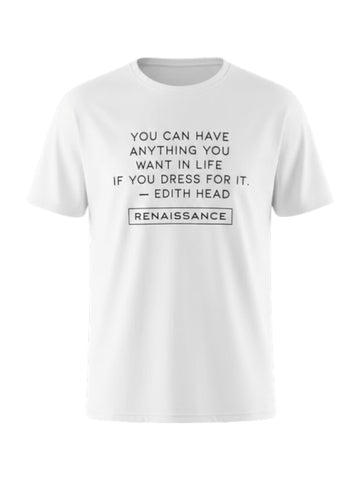 Description: A classic white t-shirt by Fruit of the Loom from the Valueweight series. The front features a black print with the motivational quote: "You can have anything you want in life if you dress for it. — Edith Head". Regular fit t-shirt, perfect for everyday styling.