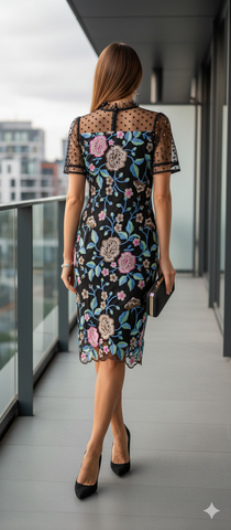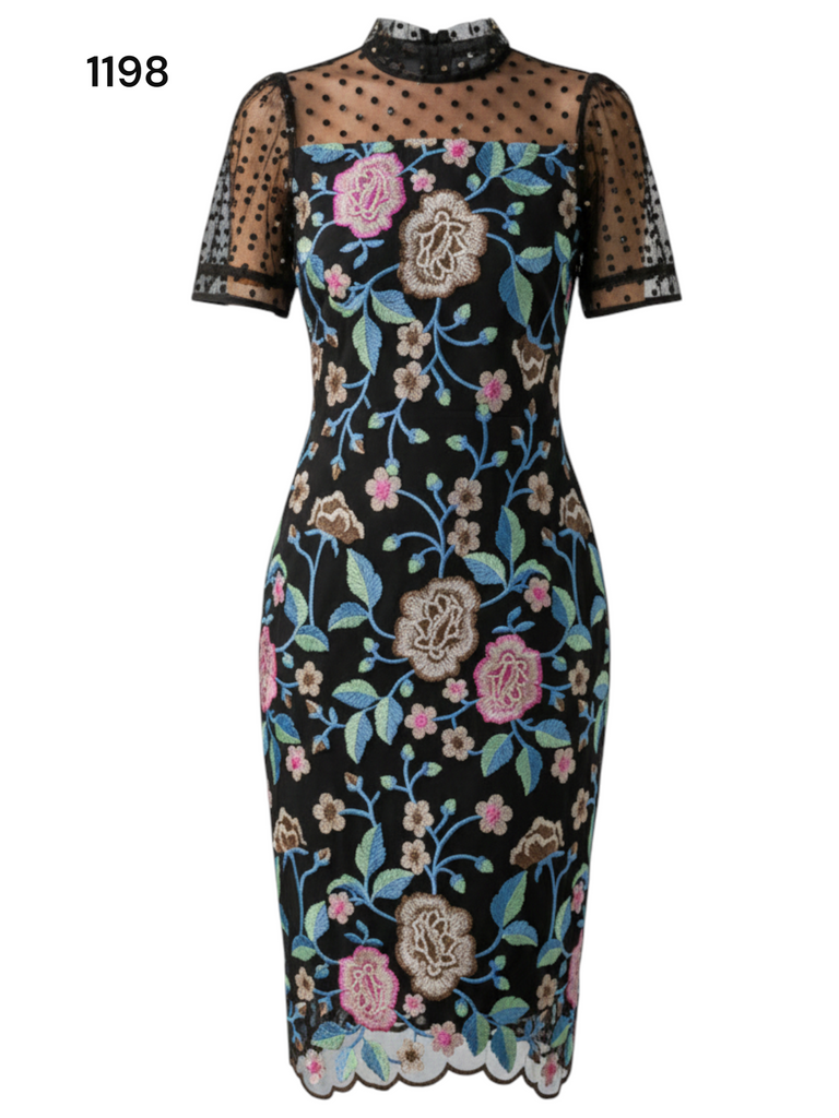 Description: This unique black cocktail dress is the essence of class and subtle extravagance, perfect for special occasions, parties and celebrations. A classic, fitted pencil cut that beautifully emphasises the figure and reaches to the knees. The dress is covered with rich, multicoloured embroidery in a rose and leaf motif, with dominant shades of pink, blue, green and brown. The upper part of the neckline and the short, puffed sleeves are made of delicate black mesh with small dots (polka dots), which adds lightness and sensuality. The neckline is finished with a high, ruffled stand-up collar, also made of mesh. The bottom of the dress has a decorative, wavy hem. The dress fastens at the back with a zip.