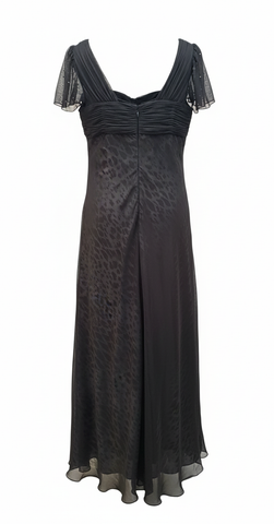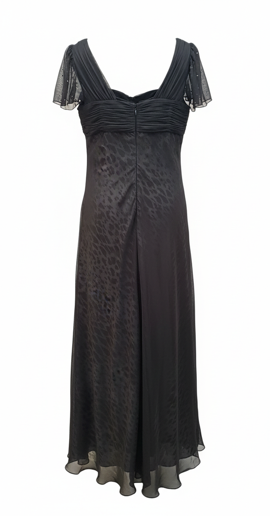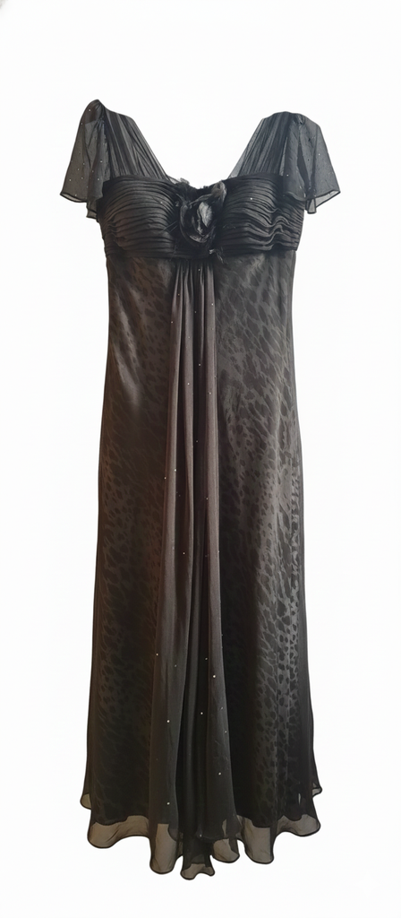 Description: This Mikael Aghal gown features a unique two-layer design. The base layer is crafted from a bold leopard print fabric, visible through a delicate top layer of sheer black mesh/tulle. The bodice is beautifully ruched with a central fabric flower detail. Short, semi-transparent sleeves and a lettuce-edge hem add a lightweight, ethereal feel. Finished with a concealed back zip fastening.