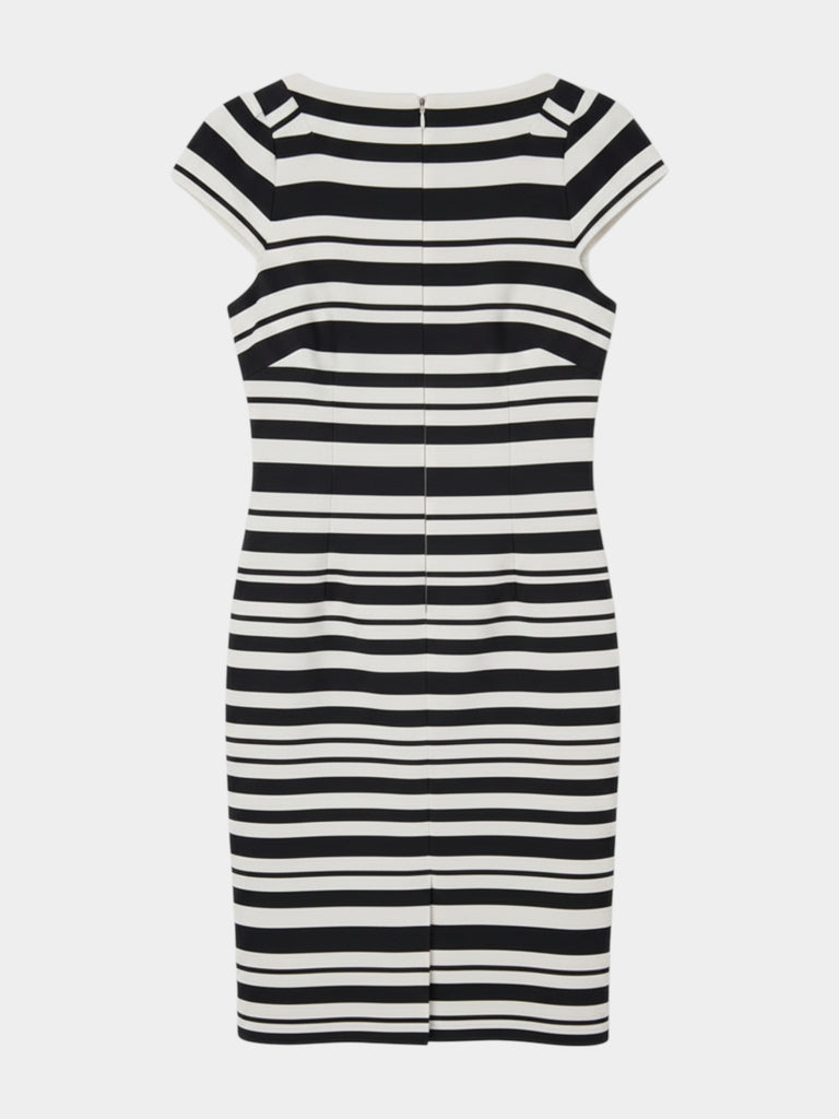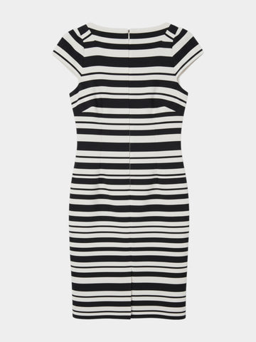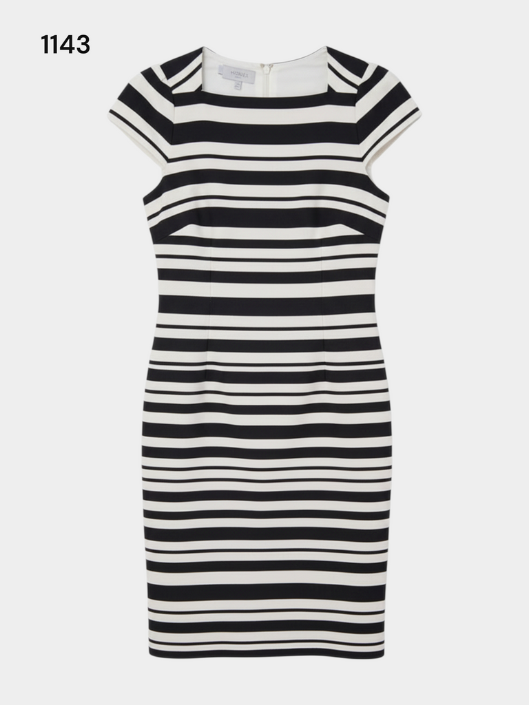 Description: A timeless pencil dress, synonymous with classic elegance and professional style. It's the perfect choice for women who appreciate a sophisticated look, perfect for both the office and formal meetings. The dress features a striking, horizontal stripe pattern combining deep black with off-white, giving it a subtle yet luxurious feel. The pencil cut perfectly accentuates and shapes the figure while ensuring comfort. The knee-length and short cap sleeves complete the elegant look. It combines formality with feminine sophistication. Styled with black or navy stilettos and subtle jewellery, it guarantees a professional and unforgettable look.