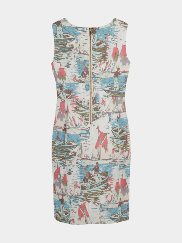 This charming, sleeveless summer dress from Joules, Model SYLVIA, features a unique, multi-colored nautical/maritime print (SEARNIE PRINT) and a comfortable fit with a back zipper. Made of 100% breathable fabric.