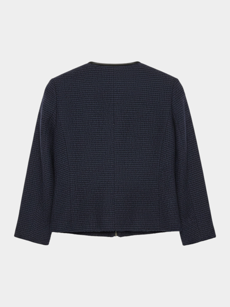 • Cut/Fit : Short jacket with a loose/straight cut, collarless (round neckline).