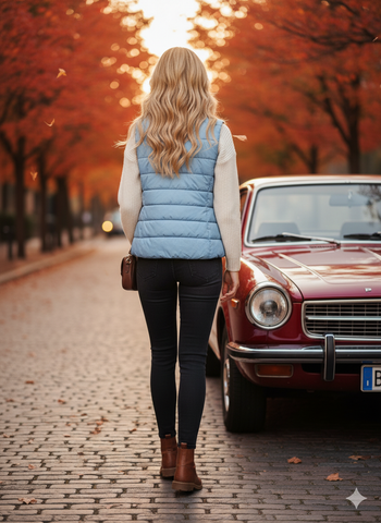 Description: This blue vest is the perfect blend of comfort and style for cooler days. Made of high-quality polyester, it offers lightweight warmth while remaining incredibly soft to the touch. The quilted structure adds a modern touch, while practical zippered pockets allow for secure storage of small items. The high collar protects the neck from the wind, while meticulous workmanship and attention to detail, such as elegant Betty Kay logo zippers, highlight its unique design. This vest is a versatile wardrobe staple, perfect for both outdoor activities and as a stylish addition to everyday outfits.