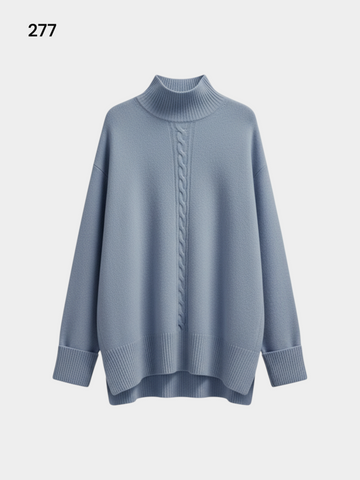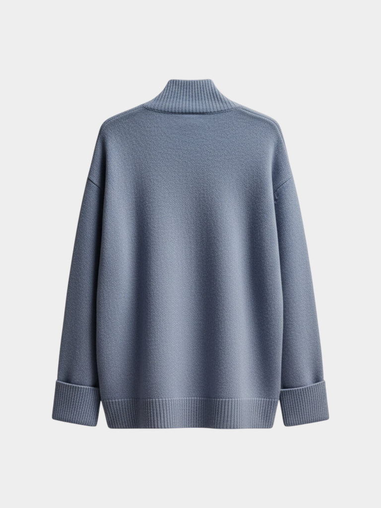 Description: Unique design and comfort for cold days. This relaxed turtleneck jumper in a fashionable, subdued shade of blue combines elegance with casual ease. Oversized with a wide, comfortable turtleneck and dropped shoulders. Perfect for layered looks.