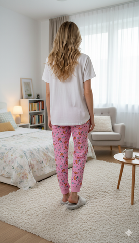 Description: Comfort and charm await in these Primark Disney pajama pants, perfect for relaxing at home. Made from soft cotton, these relaxed pants offer excellent breathability and are gentle on the skin. Their charming pink color combined with a colorful floral pattern adds magic to any moment. The elastic waistband and elasticated cuffs ensure a perfect fit and freedom of movement.