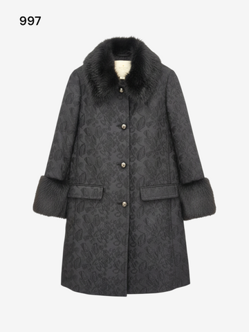 • Description: his elegant coat is captivating with its rich, black jacquard pattern and luxurious fur-trimmed collar and cuffs.Classic, straight fit with a knee-length design. Fastened at the front with stylish, large buttons.Pockets are finished with piping.