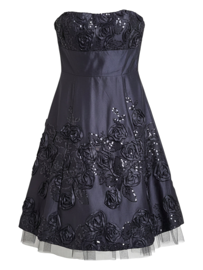 Description: The dress features a bandeau bodice that stays securely in place. The bottom is decorated with elaborate fabric roses and subtle sequins. An additional layer of tulle protruding from underneath gives the dress a lightness and ballroom flair. Perfect for weddings, balls and formal dinners.