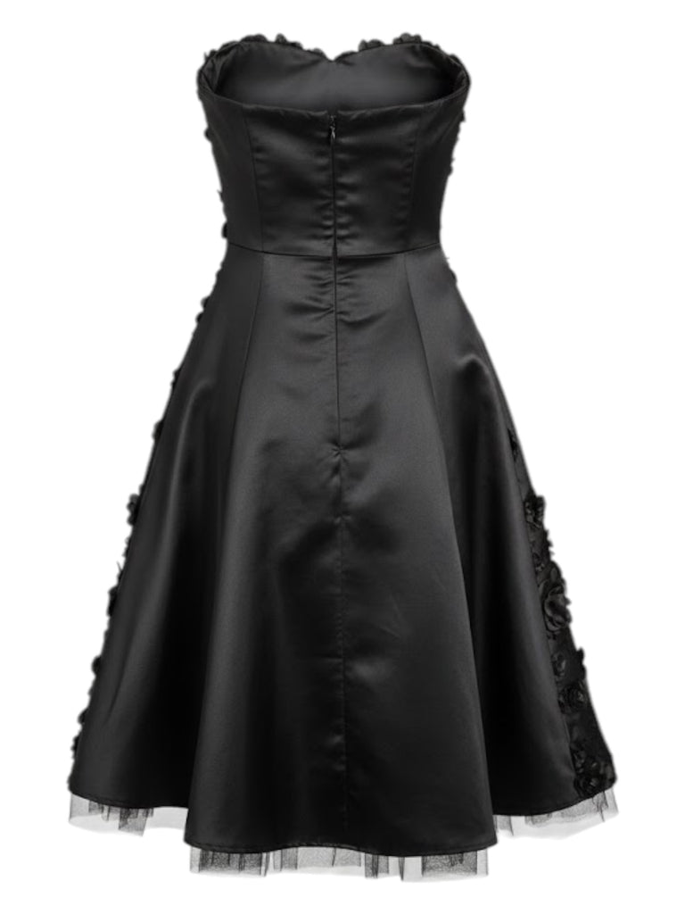Key benefits: Eye-catching 3D flowers with sequins, volume thanks to tulle lining, slimming A-line cut, discreet zip fastening.