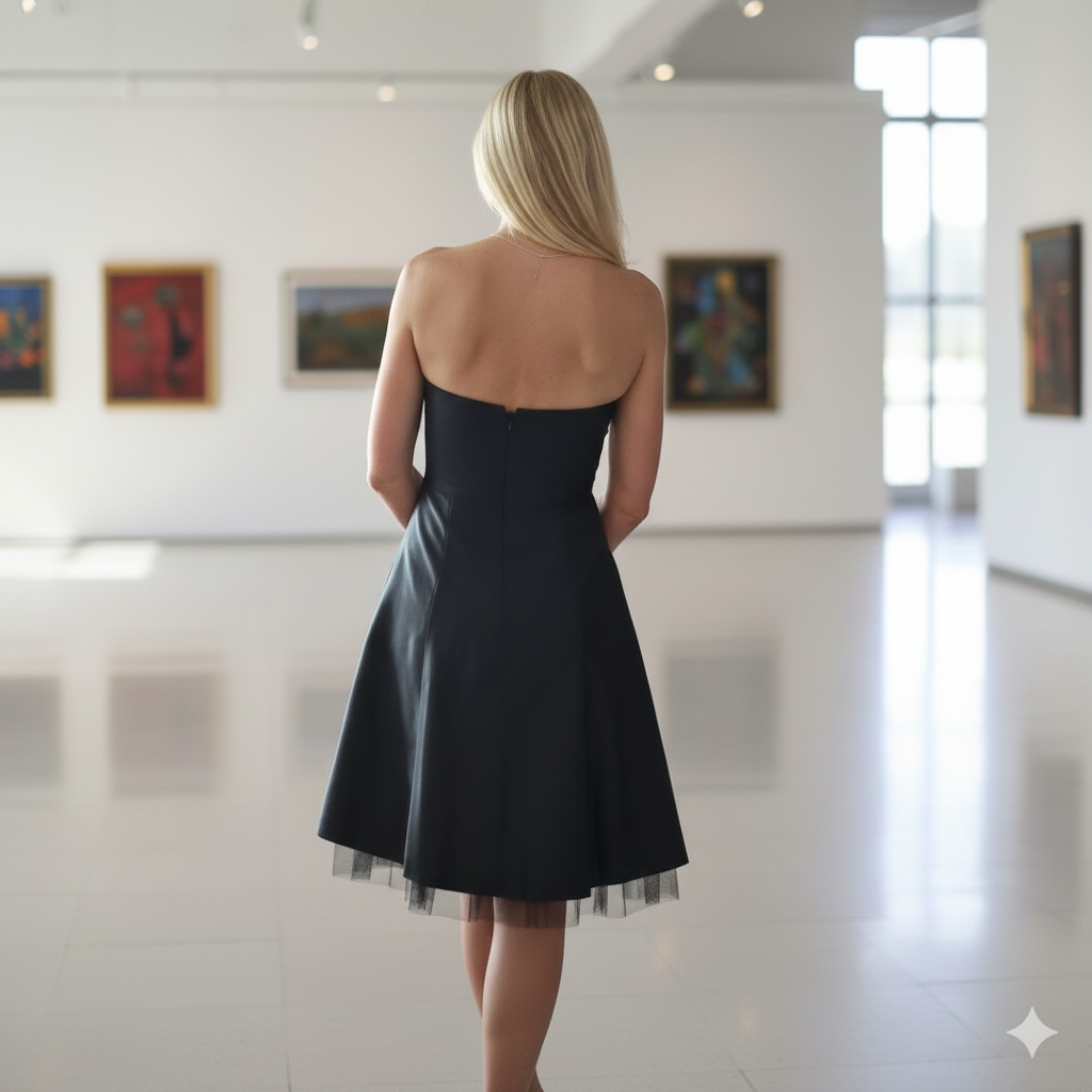 Intro: This stunning black cocktail dress from KRISP combines modern 3D design with classic elegance. Perfectly tailored to emphasise your figure and ensure you look unforgettable at any party.