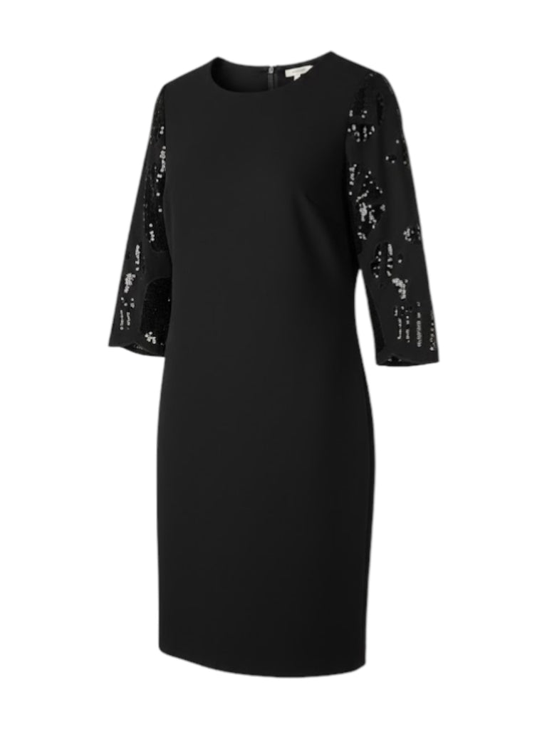 Description: A stunning black dress from Hobbs London. The highlight of this piece is the 3/4 length sleeves decorated with delicate openwork leaf embroidery, adding a modern twist to a classic evening essential. Fastened at the back with a zip