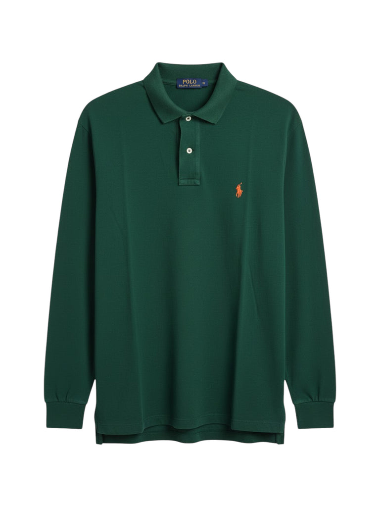 Intro: Classic Polo Ralph Lauren long sleeve polo shirt in a timeless green colour, perfect for smart-casual everyday wear.