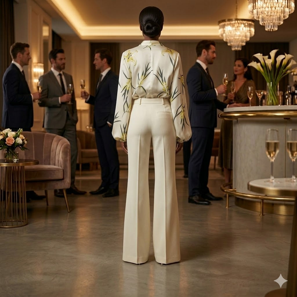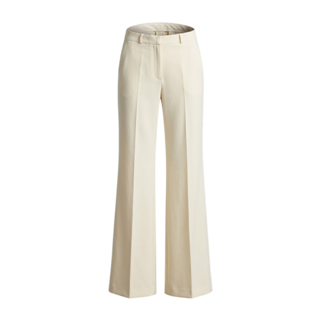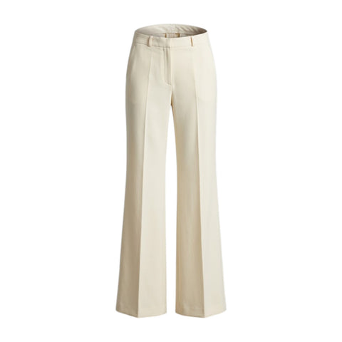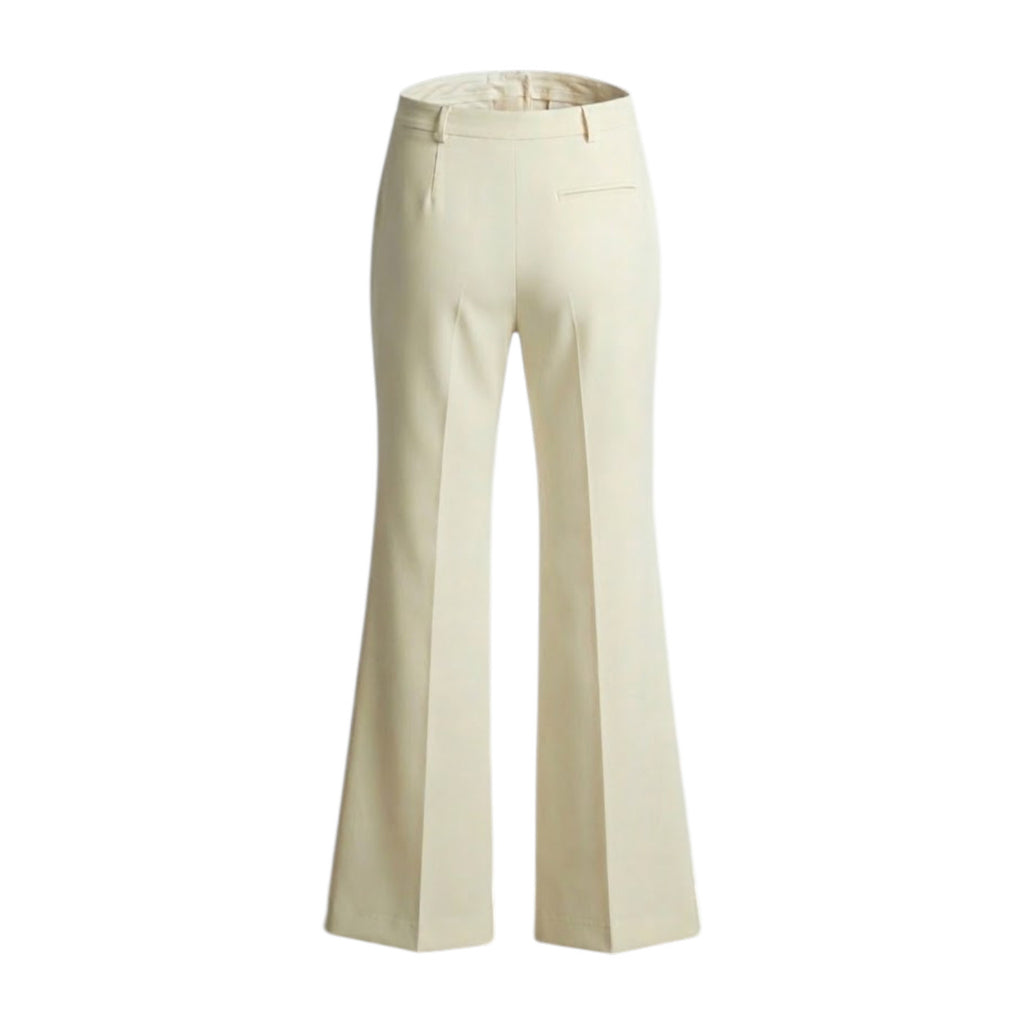 Description: These trousers feature a high-waisted fit and spectacularly flared legs. A distinctive internal seam running along the leg emphasizes their sculptural form and optically elongates the silhouette. The model includes two practical slanted front pockets and one recessed back pocket. The trousers fasten with a concealed zipper, a hook-and-eye, and an internal button, ensuring a smooth and aesthetic finish to the waistband. The premium fabric with added elastane moves perfectly with the body, while the silk-blend lining provides exceptional comfort.
